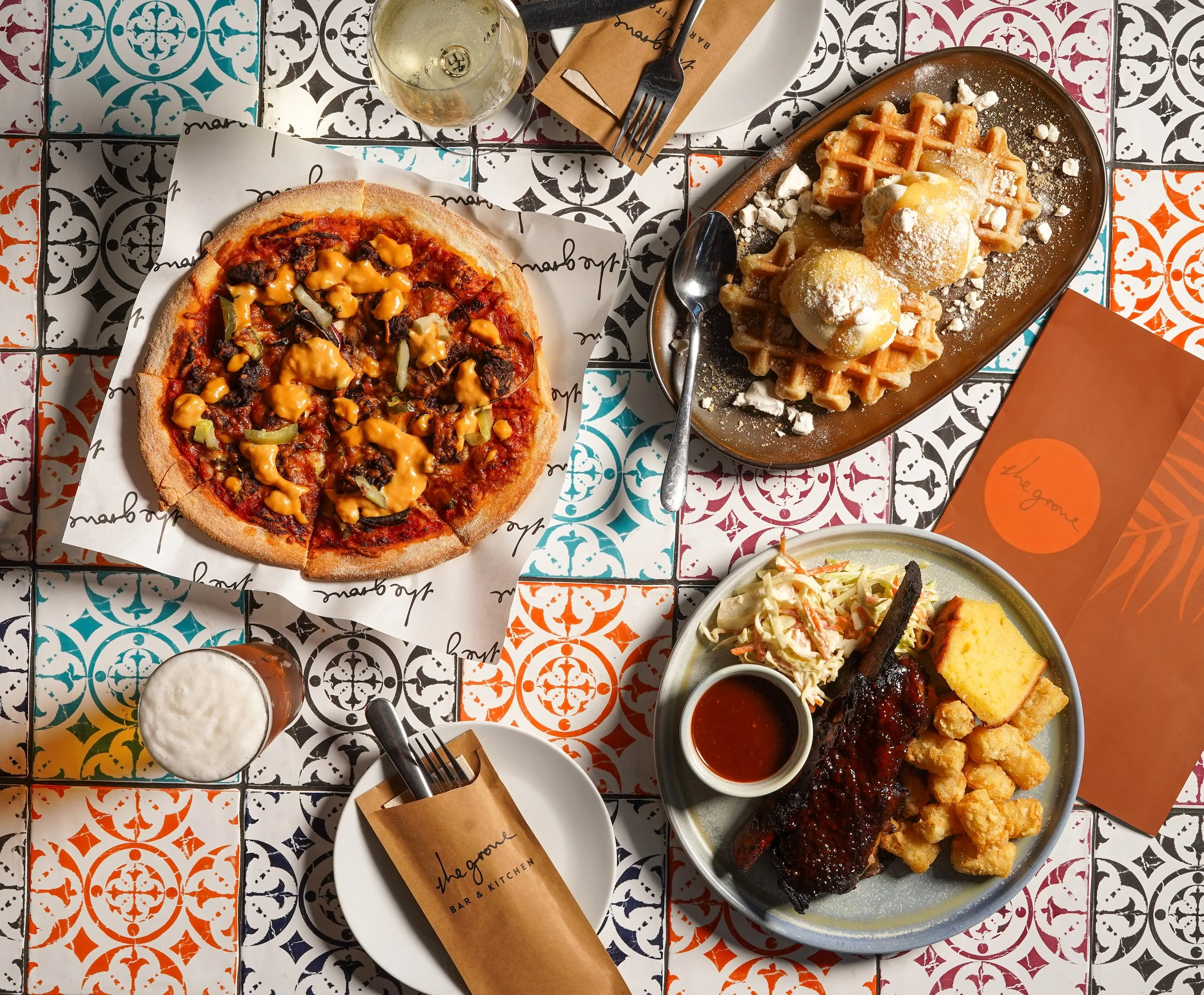 A colorful table with a pizza with cheese and meat, a plate of waffles with cream and powdered sugar, a plate with ribs, coleslaw, cornbread, and fried chicken, a glass of beer, and a glass of white wine. There is also a menu, fork, and knife on the